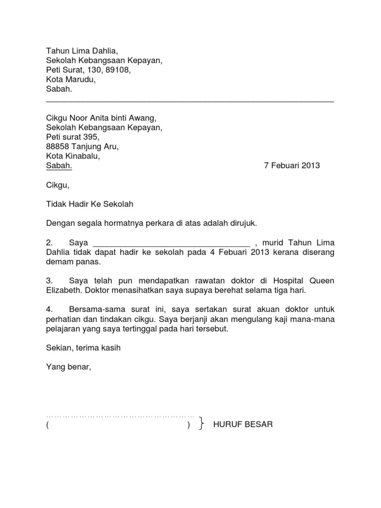 Surat Kiriman Rasmi Tentang Tidak Hadir Ke Sekolah